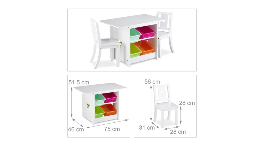 Asztal Mérete: 51,5 x 75 x 46 cm (Ma x Szé x Mé) Székek mérete: 56 x 28 x 31 cm (Ma x Szé x Mé) Tárolódobozok mérete: 12,5 x 16,5 x 26,5 cm  (Ma x Szé x Mé) Ülésmagasság: kb. 28 cm Súly: kb. 14,5 kg Anyaga: MDF, Műanyag, Fém