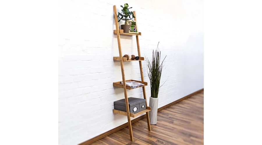 Nagyobb rendet szeretne a dolgozószobájában vagy a nappalijában de nem szeretné megtölteni a kis teret hatalmas polcokkal? Vagy egy kiváló dekorációnak is nagyszerű lakberendezési kiegészítőt keres? Ez a bambuszból készült létrapolc természetes színével bármilyen lakberendezési stílusba beilleszthető. A 4 darab különálló, különböző méretű, polc bőséges tárolóhelyet biztosít képek, virágok, dekorációk és még sok más egyéb tárolására anélkül, hogy túl sok helyet vennének el a helyiség méretéből. A nedvességálló bambuszból létrapolcot az anyaga fürdőszobában történő elhelyezésre is lehetővé teszi. Az egyes szinteken található polcok hátulról egy szintben vannak a fallal, így a fali polcok további stabilitást biztosítanak. Négy darab különböző mélységű polccal rendelkezik A polcok peremes kialakításúak, így nem kell félnie attól, hogy esetlegesen leesnek a rajta elhelyezett dekorációs kiegészítők A létrapolc egyedi kialakítása miatt különleges dekorációs kiegészítője lehet az otthonának Anyagából adódóan akár vizes helyiségekben is használható, fürdőszobában, mosókonyhában vagy pedig mosdóban egyaránt elhelyezhető ezzel értékes tárolóhelyet nyerve a használatával
