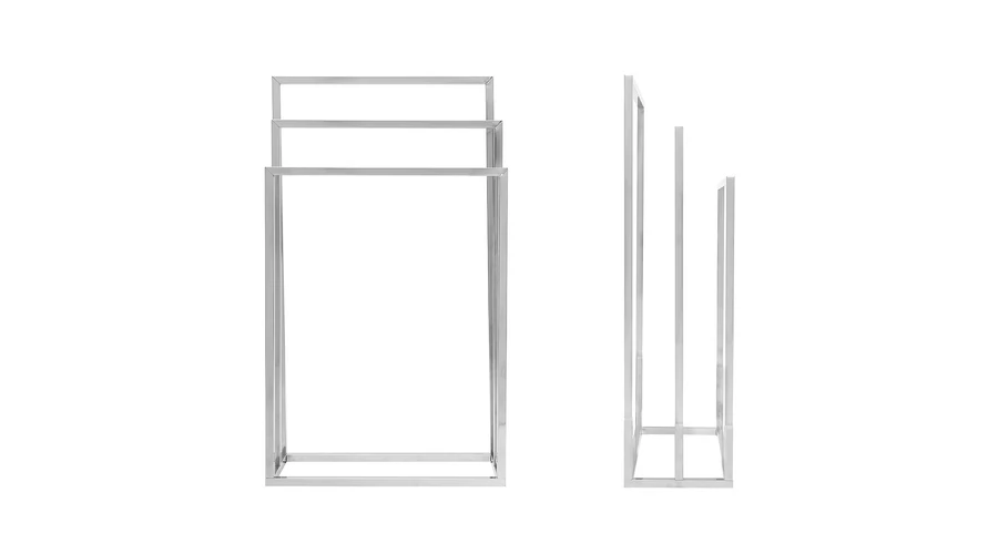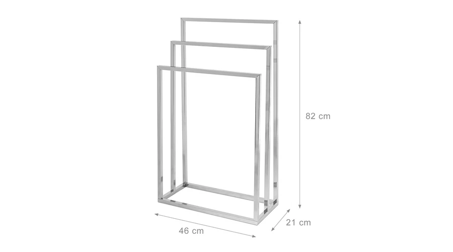 A Carol szabadonálló törölközőtartó állvány acélból készült. Magasfényű, krómozott felülete diszkréten, de elegánsan beleolvad minden fürdőszobai enteriőrbe. Az állvány letisztult, minimalista kialakítása a modern stílust hangsúlyozza ki. A három darab törölközőszárító rúd bőséges helyet biztosít a fürdőlepedőknek, amelyek az emelkedő magasságban kialakított tartórúdakon helyezhet el. A mellékelt műanyag alátétek, amelyek a törölközőtartó talpán helyezhetőek el, megakadályozzák, hogy a tartóállvány talprésze megkarcolja az alatta található felületet.